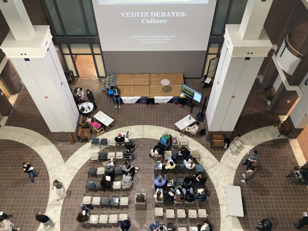 If you want to join in a Veditz debate, there are two remaining scheduled events this semester. On April 9th and 30th, the debates take place in the HMB atrium from 2:30 p.m. – 5 p.m., and the topics will center on Deaf Studies and history, respectively.