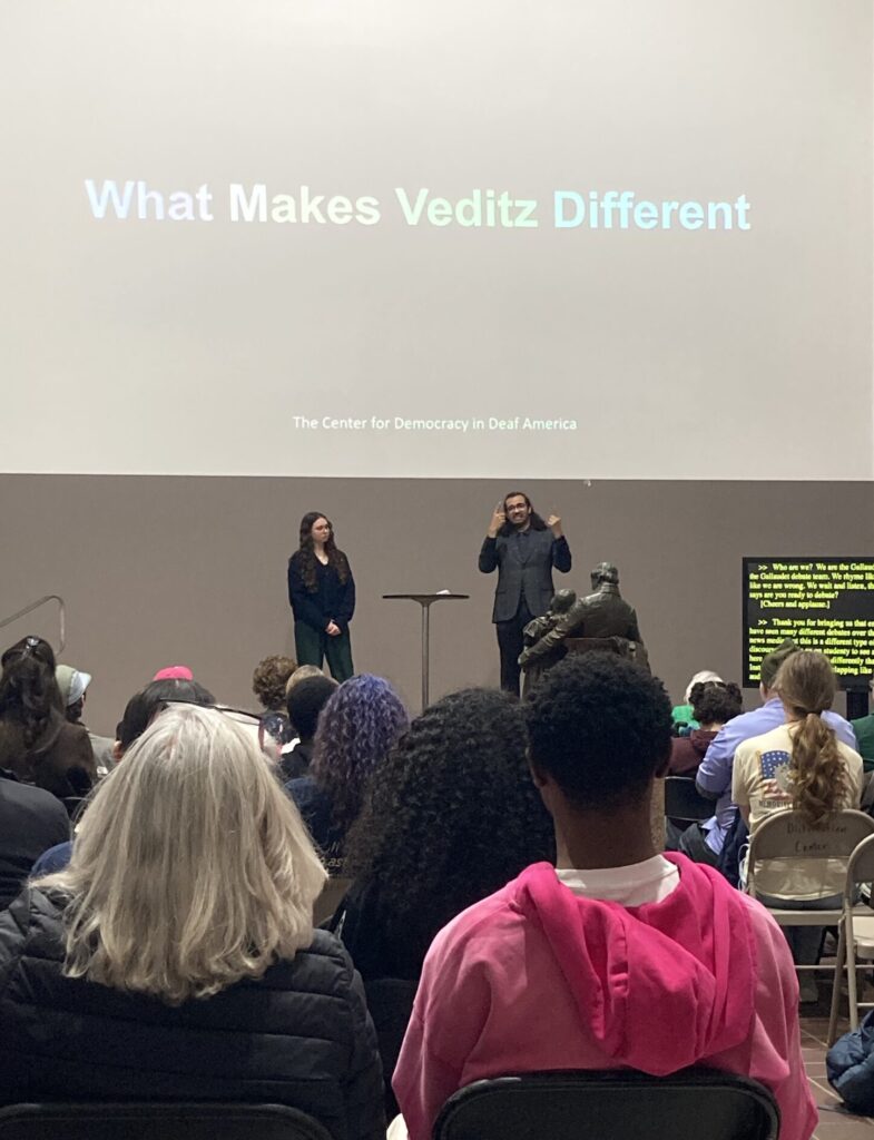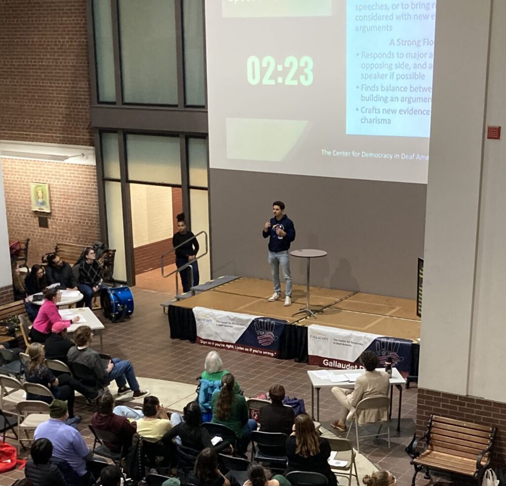 Getting participants comfortable with expressing differing opinions is key to the Veditz Debates, a new Deaf-centric debate series conceived and delivered by Gallaudet’s Center for Democracy in Deaf America (CDDA).