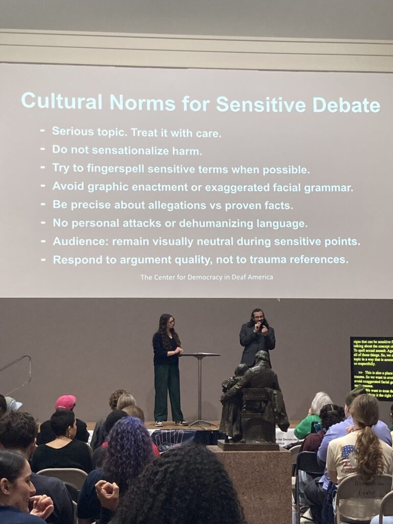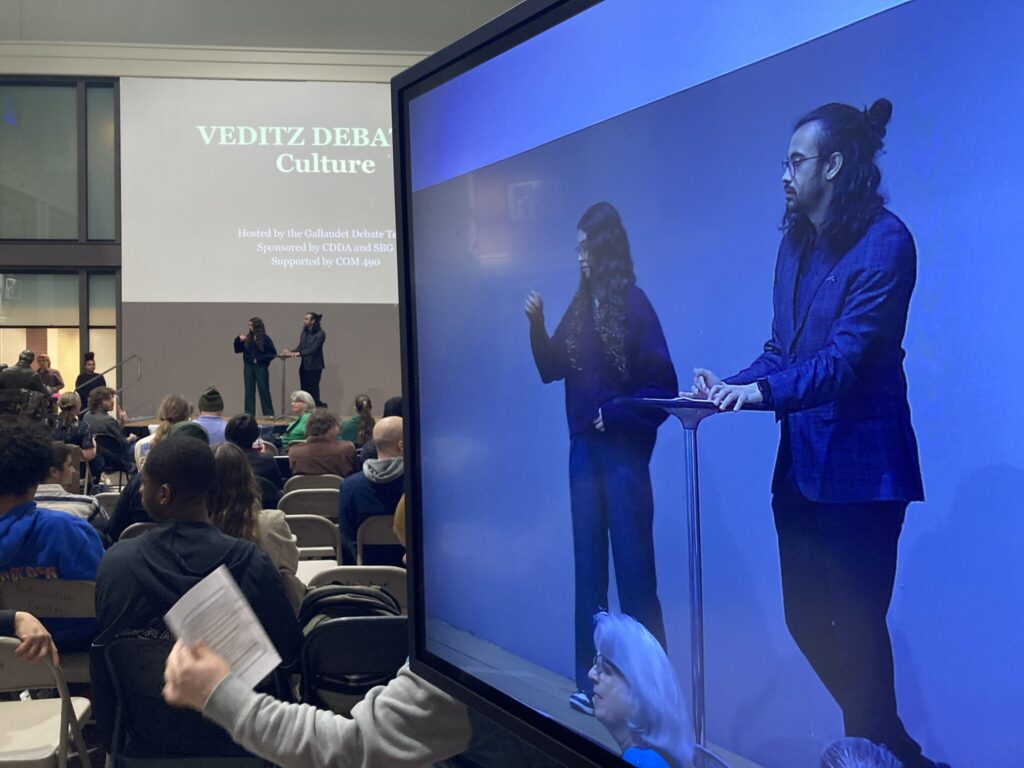 Each debate kicks off with a performance of the Veditz Song, which involves drumming and emphasizing the debate program’s motto: “sign as if you’re right and listen as if you’re wrong.”