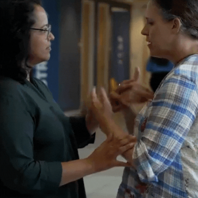 As an example, Broadway signs TREE in American Sign Language (ASL), with her right arm as a trunk and her five fingers representing branches. “ASL, signing in space, is visual. It’s not tactile.” She goes on to guide the interviewer’s arm to form TREE, but then uses her fingers to indicate someone climbing it and then cutting it down. “That conveys more tactile information, which isn’t available through ASL,” she explains. Unlike listening to someone speaking English or watching someone signing, protactile requires two people touching to exist.