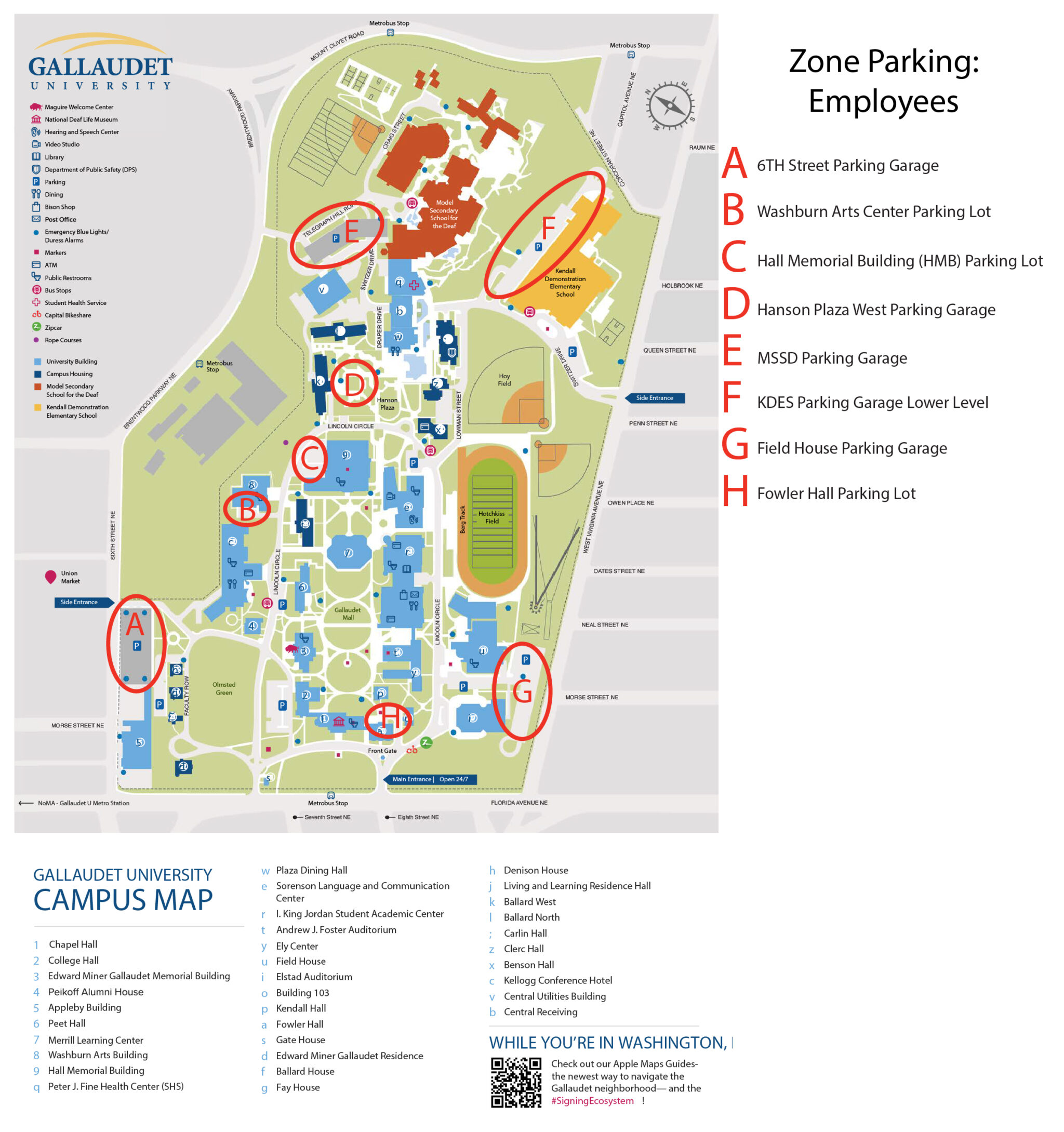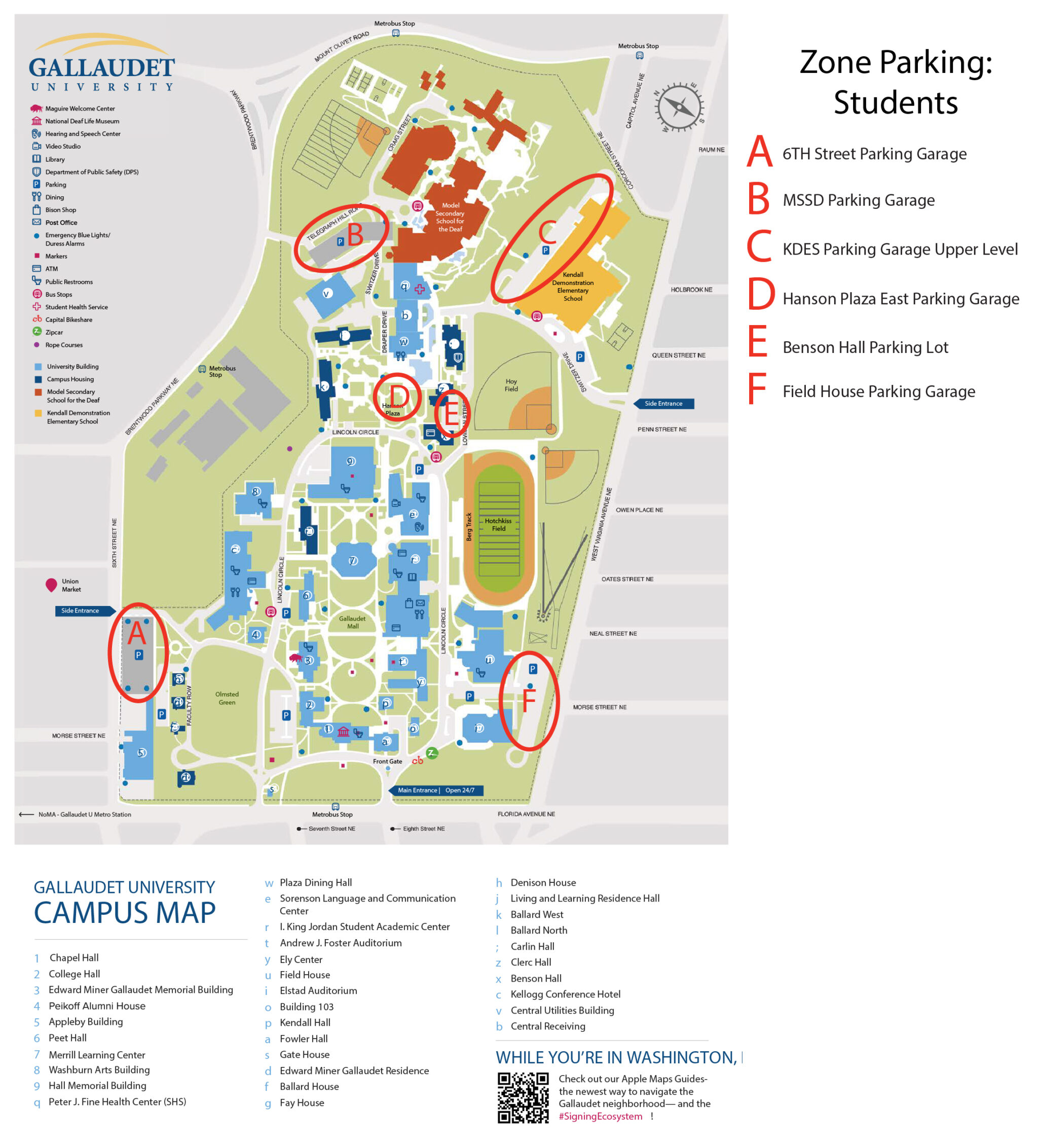 Zone parking refers to a parking lot or garage that is divided into designated zones. Gallaudet University has four designated zones: student, staff/faculty, visitor, and Allied Health Services patient parking.